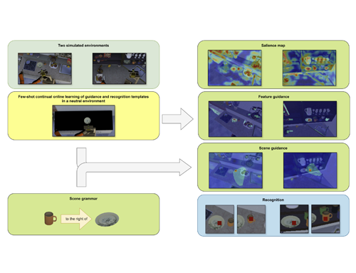 We present ROBOVERINE, a neural dynamic robotic active vision process model of selective visual attention and scene grammar in naturalistic environments. The model addresses significant challenges for cognitive robotic models of visual attention: combined bottom-up salience and topdown feature guidance, combined overt and covert attention, coordinate transformations, two forms of inhibition of return, finding objects outside of the camera frame, integrated spaceand object-based analysis, minimally supervised few-shot continuous online learning for recognition and guidance templates, and autonomous switching between exploration and visual search. Furthermore, it incorporates a neural process account of scene grammar — prior knowledge about the relation between objects in the scene — to reduce the search space and increase search efficiency. The model also showcases the strength of bridging two frameworks: Deep Neural Networks for feature extractions and Dynamic Field Theory for cognitive operations.